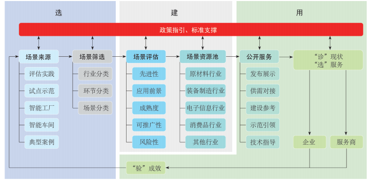數(shù)字化場(chǎng)景來(lái)源于企業(yè)實(shí)踐,包括制造企業(yè)自身的場(chǎng)景數(shù)字化建設(shè)實(shí)踐,以及數(shù)字化轉(zhuǎn)型服務(wù)商對(duì)企業(yè)的場(chǎng)景數(shù)字化改造實(shí)踐。企業(yè)的實(shí)踐效果通過(guò)測(cè)試驗(yàn)證及評(píng)估評(píng)價(jià),最終形成量化的成果形式。“選”場(chǎng)景首先需要明確場(chǎng)景的來(lái)源,可以把評(píng)估實(shí)踐、試點(diǎn)示范、智能工廠及車(chē)間、典型案例中的場(chǎng)景作為數(shù)字化場(chǎng)景的來(lái)源。其次是場(chǎng)景篩選和分類(lèi)分級(jí),為下一步場(chǎng)景資源池的建設(shè)打好基礎(chǔ),按照裝備制造、電子信息、消費(fèi)品等行業(yè)先對(duì)場(chǎng)景進(jìn)行行業(yè)分類(lèi),之后按照研發(fā)設(shè)計(jì)、生產(chǎn)制造、運(yùn)營(yíng)管理等環(huán)節(jié)進(jìn)行環(huán)節(jié)分類(lèi),最后按照具體場(chǎng)景進(jìn)行場(chǎng)景的分類(lèi)篩選,最終得到場(chǎng)景“單元”。