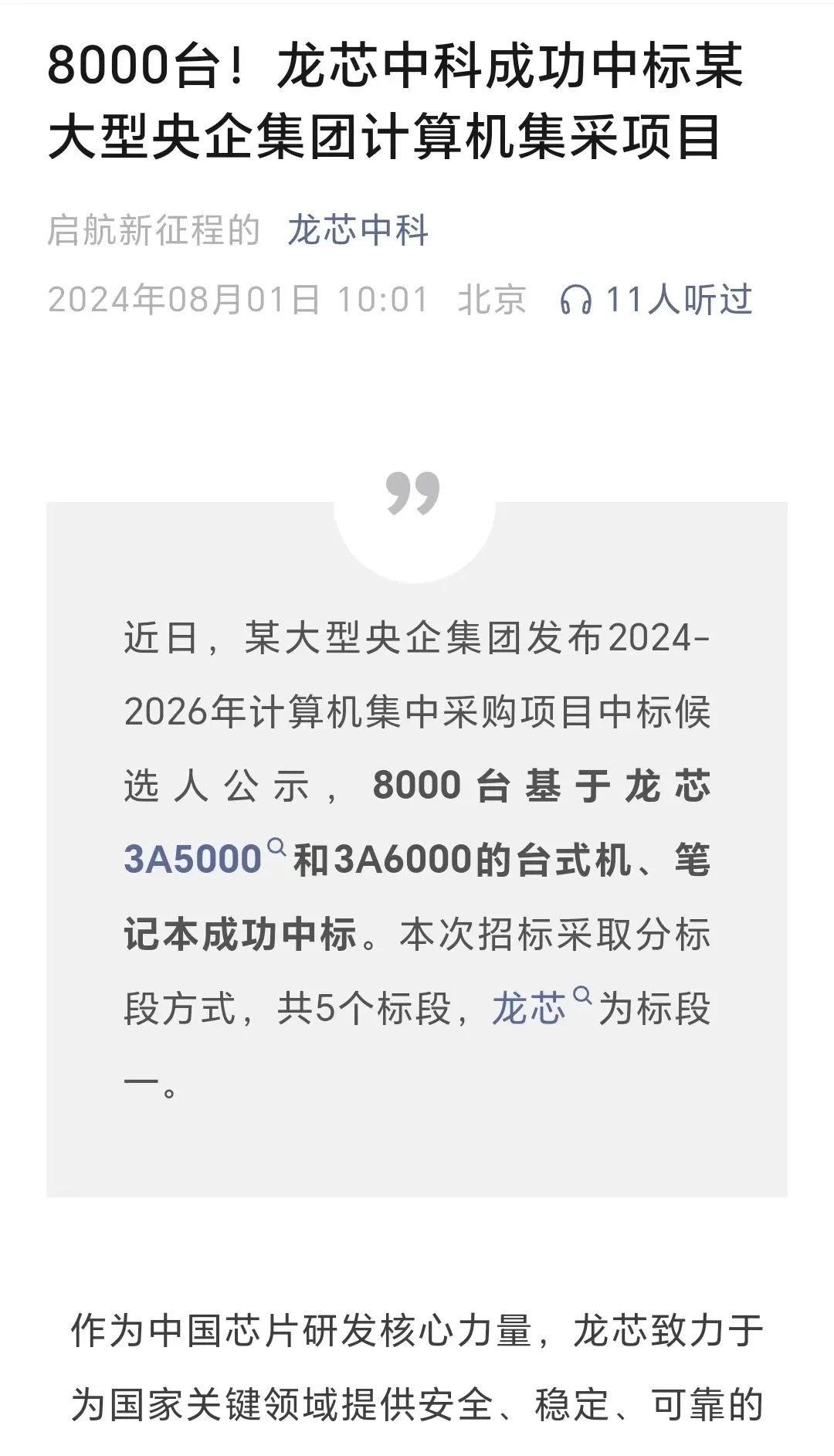 8月1日,龍芯中科在其官方微信公號中曾發(fā)文稱,近日,某大型央企集團(tuán)發(fā)布2024年-2026年計(jì)算機(jī)集中采購項(xiàng)目中標(biāo)候選人公示,8000臺基于龍芯3A5000和3A6000的臺式機(jī)、筆記本成功中標(biāo)。本次招標(biāo)采取分標(biāo)段方式,共5個(gè)標(biāo)段,龍芯為標(biāo)段一。