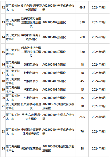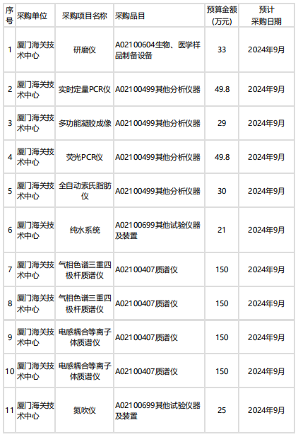廈門海關(guān)技術(shù)中心本次共計(jì)預(yù)算2748萬(wàn),預(yù)采購(gòu)實(shí)時(shí)定量PCR儀、多功能凝膠成像系統(tǒng)、氣相色譜三重四級(jí)桿質(zhì)譜儀、電感耦合等離子體質(zhì)譜儀等。
