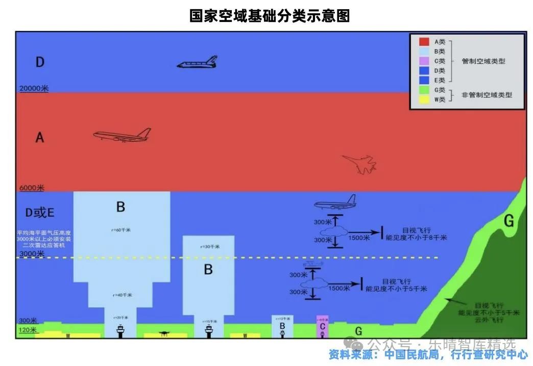 202312月民航局發布的《國家空域基礎分類方法》中,將空域劃分為ABCDEGW7類,其中,ABCDE類為管制空域,GW類為非管制空域。