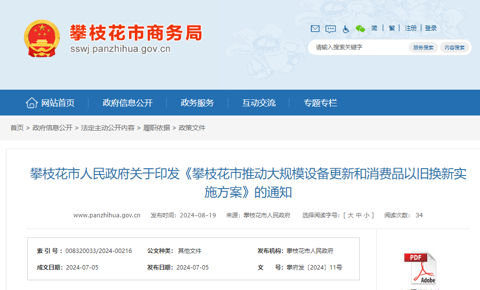 攀枝花市推動大規(guī)模設備更新和消費品以舊換新實施方案