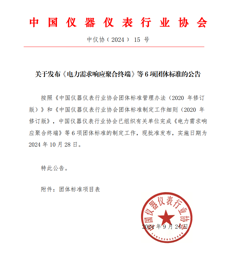 近日,根據(jù)《中國(guó)儀器儀表行業(yè)協(xié)會(huì)團(tuán)體標(biāo)準(zhǔn)管理辦法》的規(guī)定,中國(guó)儀器儀表行業(yè)協(xié)會(huì)(簡(jiǎn)稱“協(xié)會(huì)”)組織完成了由協(xié)會(huì)電工儀器儀表分會(huì)提出的《電力需求響應(yīng)聚合終端》等4項(xiàng)、試驗(yàn)儀器分會(huì)提出的《溫差電器件致冷性能測(cè)試方法》等2項(xiàng)團(tuán)體標(biāo)準(zhǔn)的制定工作,現(xiàn)予以發(fā)布,特此公告。