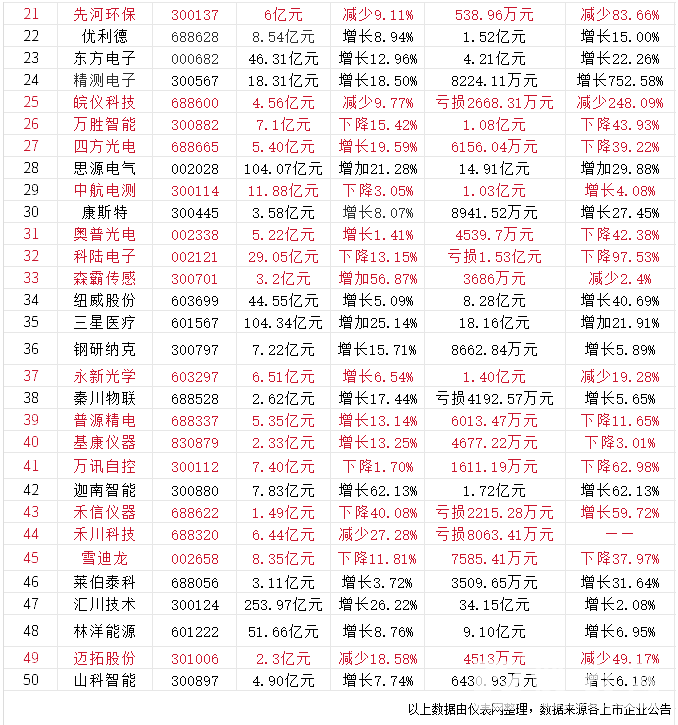 從虧損程度來(lái)看,50家企業(yè)中凈利潤(rùn)出現(xiàn)虧損的有6家,分別為譜尼測(cè)試虧損2.34億元,同比減少322.2%;皖儀科技虧損2668.31萬(wàn)元,同比減少248.09%;科陸電子虧損1.53億元,同比下降97.53%;秦川物聯(lián)虧損4192.57萬(wàn)元,同比增長(zhǎng)5.65%;禾信儀器虧損2215.28萬(wàn)元,同比增長(zhǎng)59.72%;禾川科技虧損8063.41萬(wàn)元。