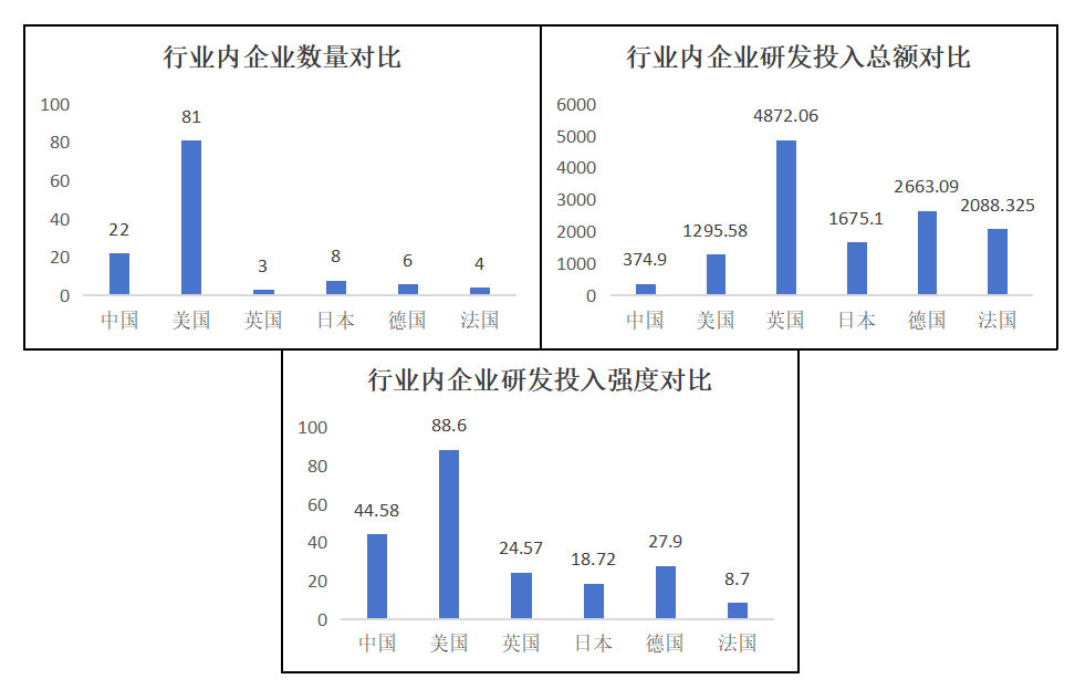 四是汽車和零部件行業上,中國科技領軍企業的數量優勢并不明顯;其平均研發投入總額僅略高于英國,處于較低的水平;其平均研發投入強度則大約處于中等偏上的水平??傊?,中國科技領軍企業在汽車和零部件行業上的發展比較一般,體量優勢不明顯,創新水平不高;在平均研發投入總額較低的情況下卻有著較高的平均研發投入強度,更是說明了我國汽車和零部件行業的營收情況不容樂觀。