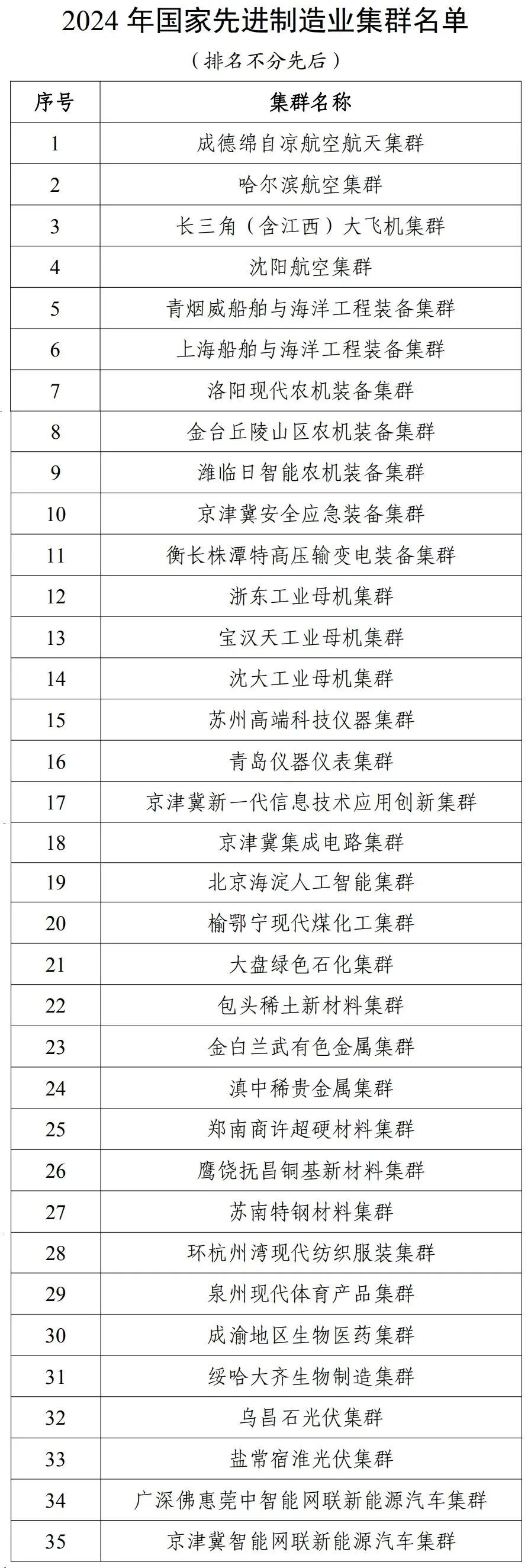 為貫徹落實黨中央、國務院決策部署,培育壯大先進制造業集群,工業和信息化部組織開展2024年先進制造業集群競賽。經小組賽、綜合賽評審并向社會公示,現公布成德綿自涼航空航天集群等35個集群為國家先進制造業集群(以下簡稱國家級集群),有關事項通知如下。