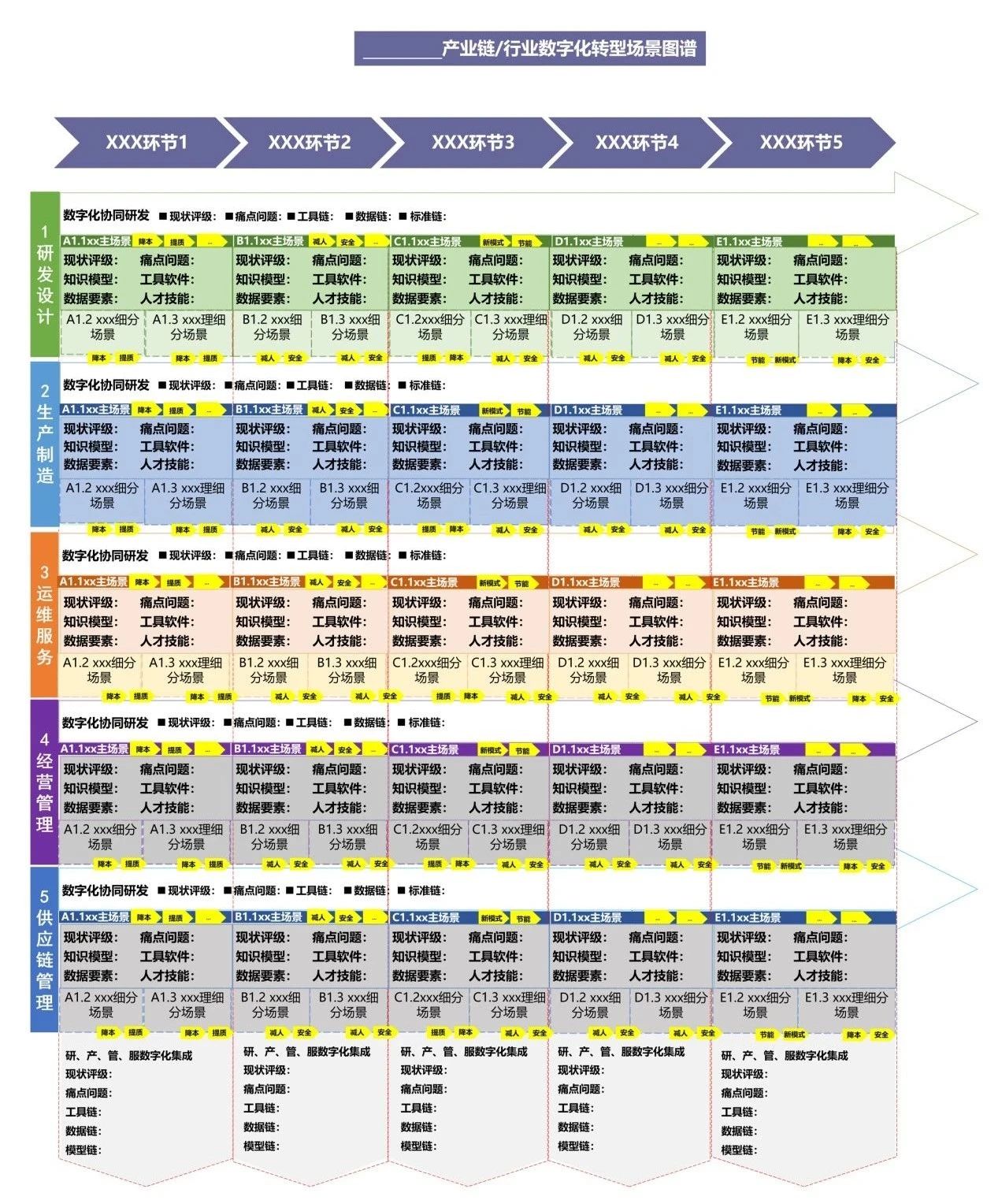 聚焦產(chǎn)業(yè)鏈上下游企業(yè)研發(fā)設(shè)計(jì)、生產(chǎn)制造、運(yùn)維服務(wù)、經(jīng)營(yíng)管理、供應(yīng)鏈管理等場(chǎng)景,以場(chǎng)景為切入點(diǎn)梳理數(shù)字化轉(zhuǎn)型痛點(diǎn)需求,繪制重點(diǎn)行業(yè)、重點(diǎn)產(chǎn)業(yè)鏈數(shù)字化轉(zhuǎn)型場(chǎng)景圖譜(簡(jiǎn)稱“一圖譜”),明確企業(yè)數(shù)字化轉(zhuǎn)型路徑,促進(jìn)產(chǎn)業(yè)鏈上下游企業(yè)協(xié)同開展轉(zhuǎn)型升級(jí)。分場(chǎng)景梳理數(shù)據(jù)要素、知識(shí)模型、工具軟件、人才技能等數(shù)字化轉(zhuǎn)型要素清單(簡(jiǎn)稱“四清單”,合稱“一圖四清單”),助力政產(chǎn)學(xué)研各界聯(lián)合攻堅(jiān)場(chǎng)景數(shù)字化轉(zhuǎn)型關(guān)鍵難點(diǎn)。