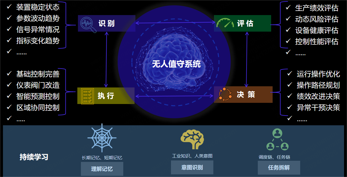 “無人”值守能夠?qū)⑵髽I(yè)較為稀缺的人力資源從復(fù)雜、繁瑣、重復(fù)的操作活動(dòng)中解放出來,提升裝置運(yùn)行水平、安全水平和效益,減少非計(jì)劃停工,對(duì)裝置的長(zhǎng)周期、高效自主運(yùn)行具有深遠(yuǎn)意義,是化工裝置“安、穩(wěn)、長(zhǎng)、滿、優(yōu)”高度自主運(yùn)行的集中體現(xiàn)。區(qū)別于傳統(tǒng)的“黑屏操作”,“無人”值守的關(guān)鍵在于裝置系統(tǒng)能夠具備“識(shí)別-評(píng)估-決策-執(zhí)行”的自主能力,實(shí)現(xiàn)對(duì)外部的需求或干擾進(jìn)行自主響應(yīng),同時(shí)又可對(duì)系統(tǒng)內(nèi)部要素的完整性、健康性、穩(wěn)定性進(jìn)行自我管理,最終達(dá)到無需人工干預(yù)、實(shí)現(xiàn)無人值守的目標(biāo)。