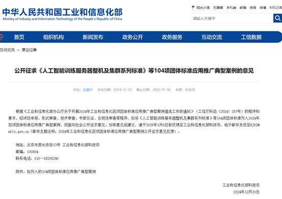 工信部12月30日發(fā)布消息,根據(jù)《工業(yè)和信息化部辦公廳關(guān)于開展2024年工業(yè)和信息化百項團體標準應(yīng)用推廣典型案例遴選工作的通知》(工信廳科函〔2024〕257號)的程序和要求,經(jīng)項目申報、形式審查、技術(shù)審查、專家論證、合規(guī)性審查等程序,擬將《人工智能訓(xùn)練服務(wù)器整機及集群系列標準》等104項團體標準列入2024年百項團體標準應(yīng)用推廣典型案例,現(xiàn)面向社會公開征求意見。