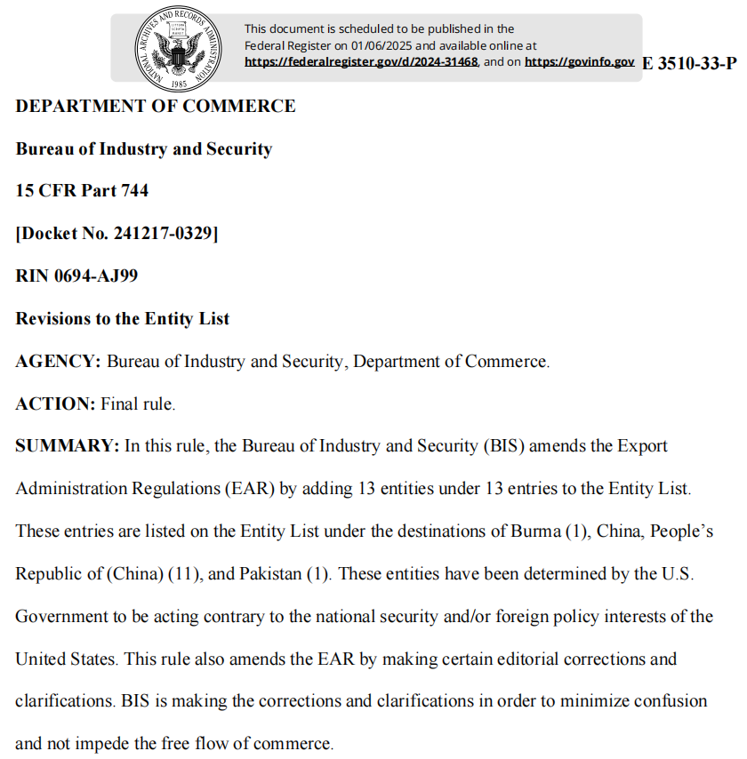 這一決定將于16日正式生效,標志著美國對包括中國在內的國家特定實體的出口管制措施進一步收緊。