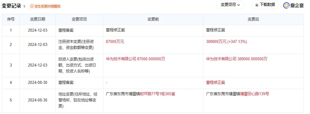 123日,華為對其全資持股的機器人企業——東莞極目機器有限公司,增資30余億元,注冊資本從8.7億人民幣增至38.9億人民幣,增幅約347%。