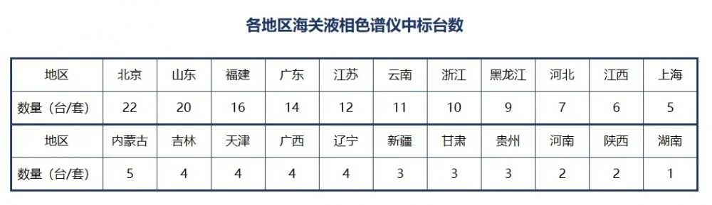 截至2024年12月31日,依據中國政府采購網公開信息不完全統計,在已公布的中標結果中,全國22個省、直轄市、自治區的海關相關單位完成了液相色譜儀采購中標工作。此次共中標167臺(套)液相色譜儀,總中標(成交)金額超8562萬元人民幣,共有11家品牌成功中標。