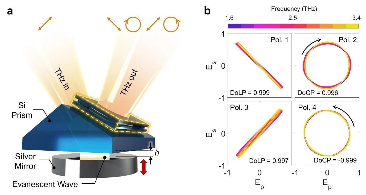 在這項(xiàng)研究中,科研人員新研發(fā)的太赫茲波偏振調(diào)制器,可以靈活控制太赫茲波偏振,輸出任意的偏振態(tài)。“相比已報道的其他太赫茲波偏振調(diào)制器,我們研發(fā)的偏振調(diào)制器在多功能性、大工作帶寬以及高控制精度方面取得顯著突破,可為光譜檢測提供先進(jìn)的偏振解析能力,能滿足材料物理特性研究、生物制藥品質(zhì)監(jiān)測等應(yīng)用需求,也可作為下一代信息技術(shù)的核心部件,在高速通信中降低傳輸損耗、提高數(shù)據(jù)吞吐量。”陳學(xué)權(quán)說。