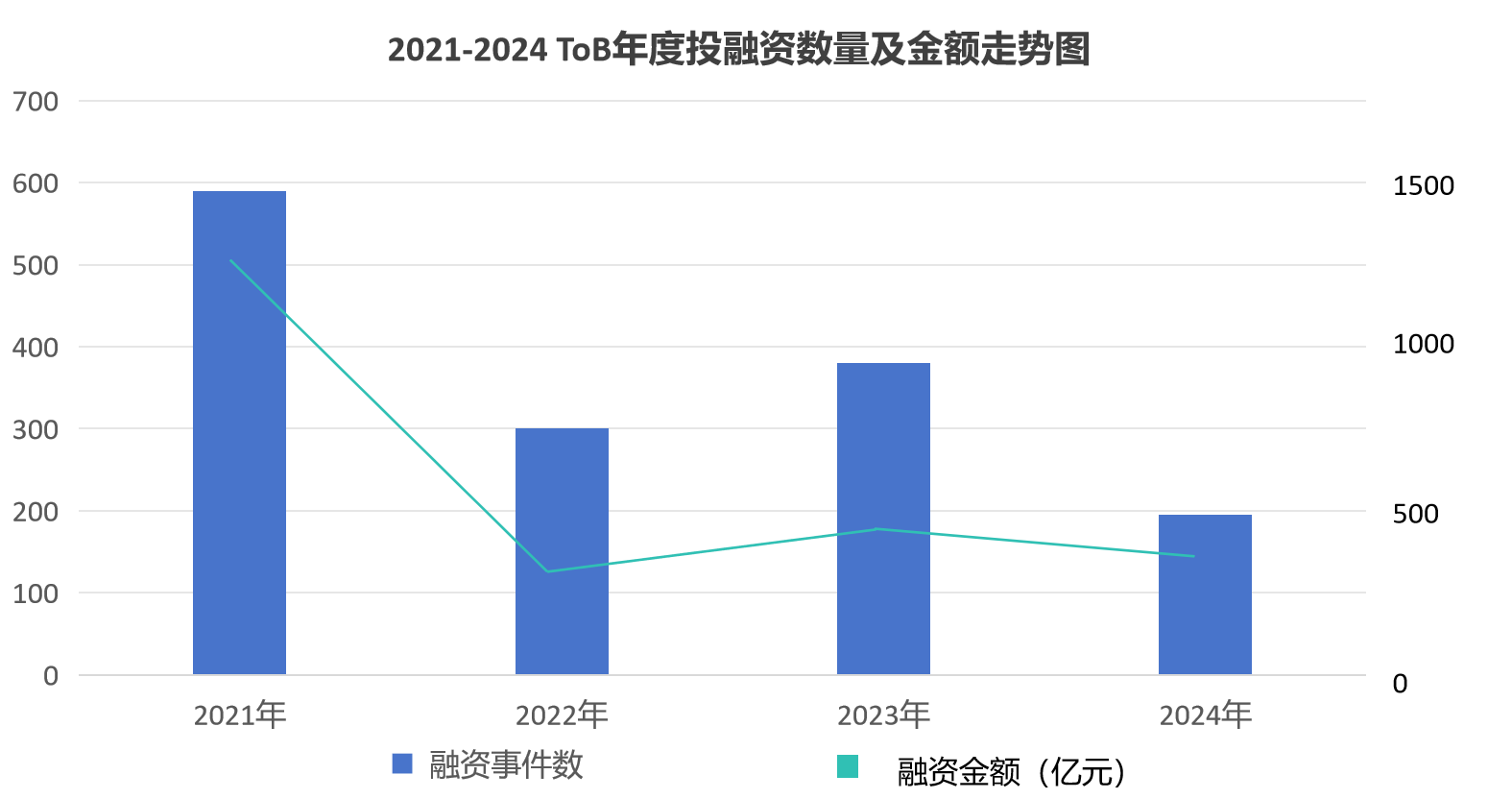縱觀整個ToB軟件市場,技術(shù)支撐、垂直行業(yè)、工業(yè)軟件這三大類連續(xù)兩年保持為融資核心領(lǐng)域的TOP3。其中,2021年是近四年里的“融資高峰年”,隨后幾年進入調(diào)整期,2022年間無論融資數(shù)量還是金額大幅下滑,這與宏觀經(jīng)濟環(huán)境、資本市場收緊及行業(yè)泡沫清理密切相關(guān);2023年的回升顯示行業(yè)逐步走向理性,優(yōu)質(zhì)項目開始重新受到資本青睞;2024年融資總額未見顯著復(fù)蘇,但行業(yè)資金更加聚焦于核心領(lǐng)域和頭部企業(yè)。