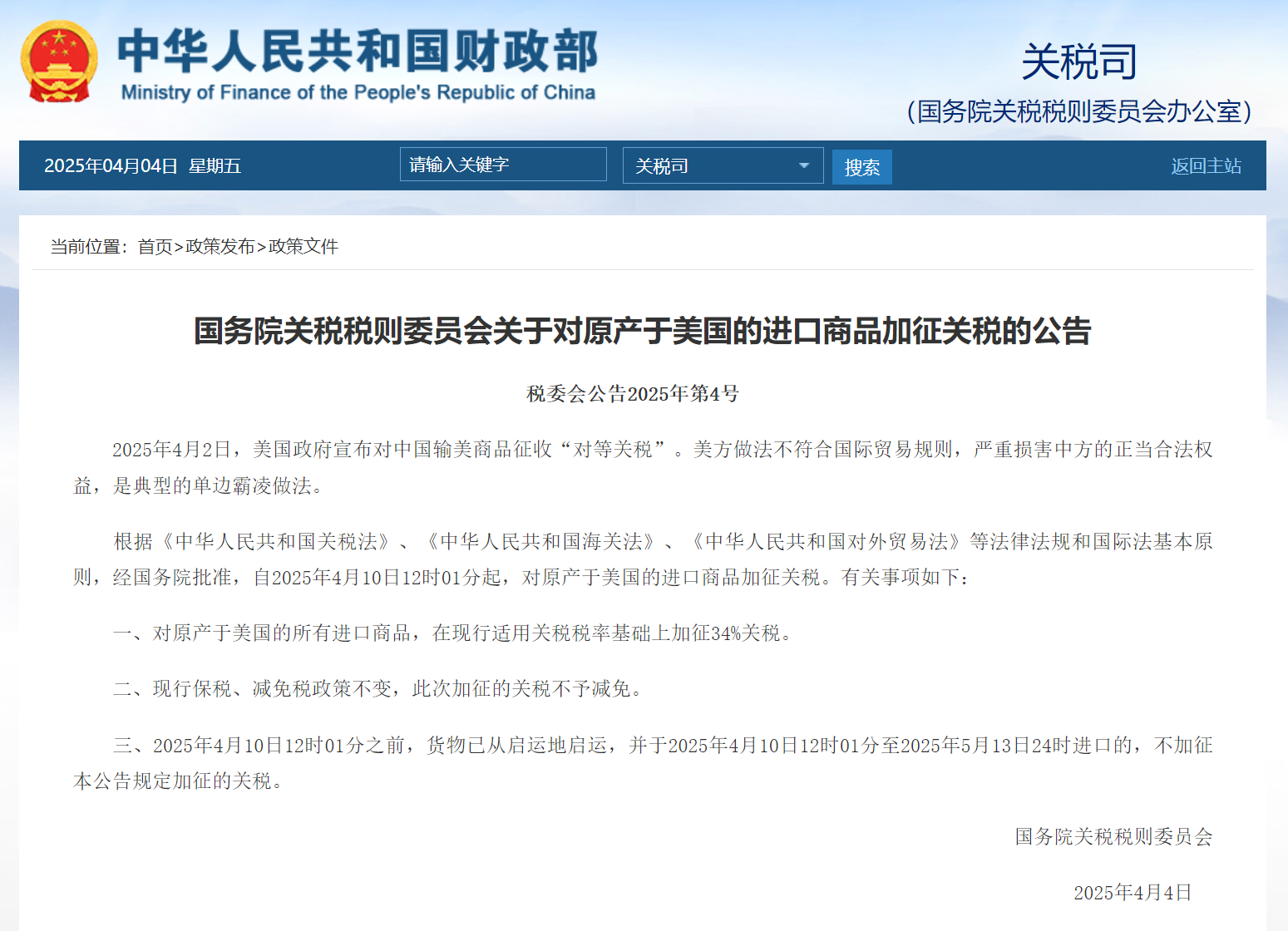 42日,美國政府宣布對所有貿易伙伴加征對等關稅,對中國商品加征稅率高達34%44日,中國國務院關稅稅則委員會發布公告,自410日起對原產于美國的所有進口商品同等加征34%關稅。