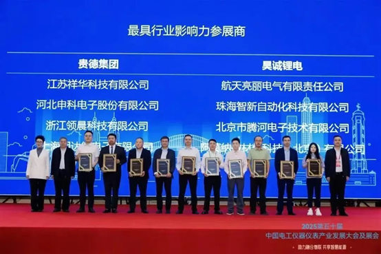 展會規模空前,參會人數400余人,近200家參展企業展示了傳感器、電容器、開關與繼電器等產品。采用 “以會帶展、以展促會” 模式,打通電工儀器儀表行業全產業鏈條,推動各環節緊密銜接與協同發展。今年恰逢第50屆行業大會,為彰顯會議的特殊意義和重要貢獻,特別舉辦了“最具行業影響力展商”評選活動,評選出貴德集團等十家行業內最具代表性的品牌企業。工業和信息化部裝備工業一司原一級巡視員、中國儀器儀表行業協會九屆理事會副理事長候選人(駐會)苗長興,中國儀器儀表行業協會副秘書長程紅,以及哈爾濱電工儀表研究所有限公司黨委書記、董事長趙斌為這10家最具影響力的參展商隆重授牌。