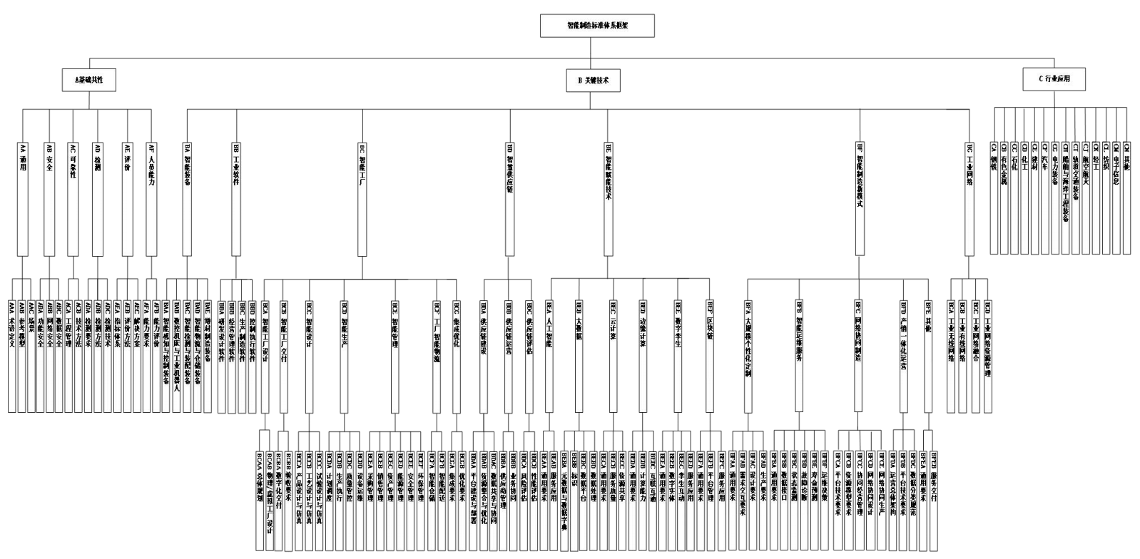 智能制造標(biāo)準(zhǔn)體系框架圖包含了智能制造標(biāo)準(zhǔn)體系的基本組成單元,具體包括A基礎(chǔ)共性、B關(guān)鍵技術(shù)、C行業(yè)應(yīng)用等3個(gè)部分,如圖3所示。