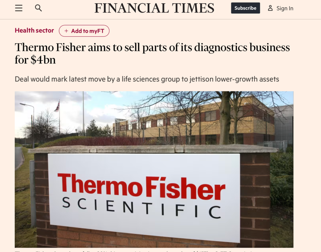 待售的診斷業(yè)務(wù)部門年調(diào)整后收益約3億美元,年銷售額達14億美元,約占賽默飛世爾整體專業(yè)診斷事業(yè)部收入的三分之一。知情人士補充稱,公司期望以超40億美元的價格完成交易。