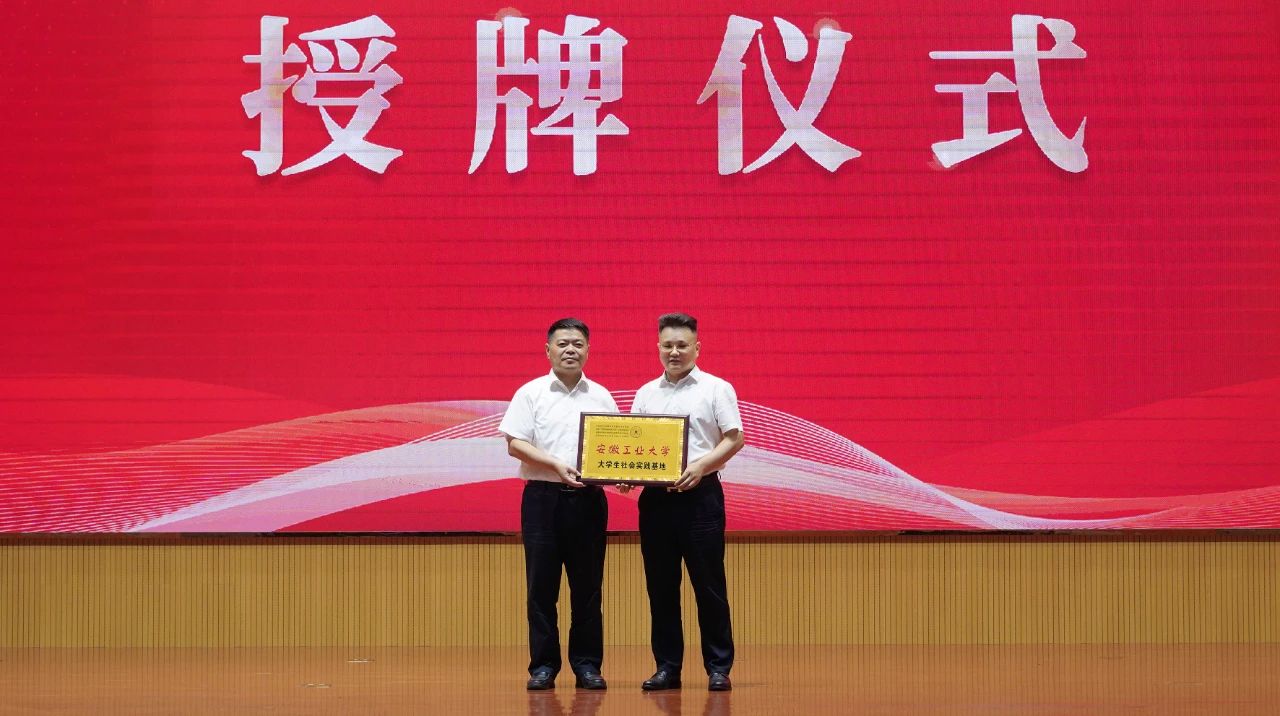 會議期間舉行了“大學生社會實踐基地”授牌儀式,安徽工業大學黨委書記陸林與天康集團黨委副書記、總經理毛文章代表雙方授接牌匾。