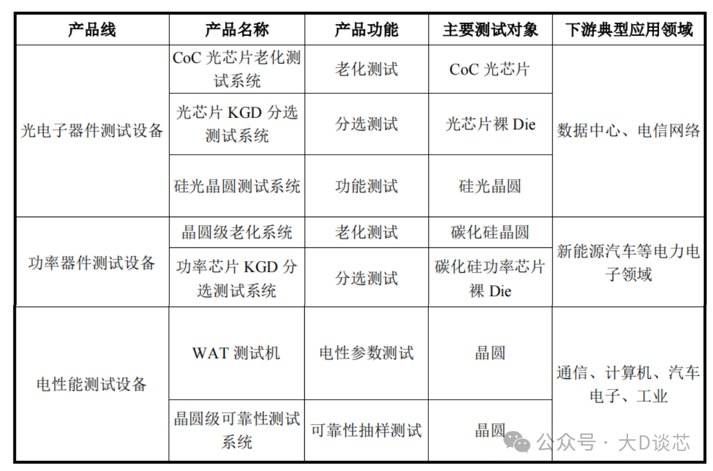 公司半導(dǎo)體測試設(shè)備包括光電子器件測試設(shè)備、功率器件測試設(shè)備和電性能測試設(shè)備,其中:光電子器件測試設(shè)備主要包括CoC光芯片老化測試系統(tǒng)、光芯片KGD分選測試系統(tǒng)、硅光晶圓測試系統(tǒng)等產(chǎn)品,分別用于CoC封裝級光芯片老化測試、裸Die 級光芯片分選測試、晶圓級硅光芯片功能測試,全面覆蓋封裝級光芯片、裸Die 級光芯片、晶圓級硅光芯片等光通信產(chǎn)業(yè)鏈上游核心環(huán)節(jié)測試需求。