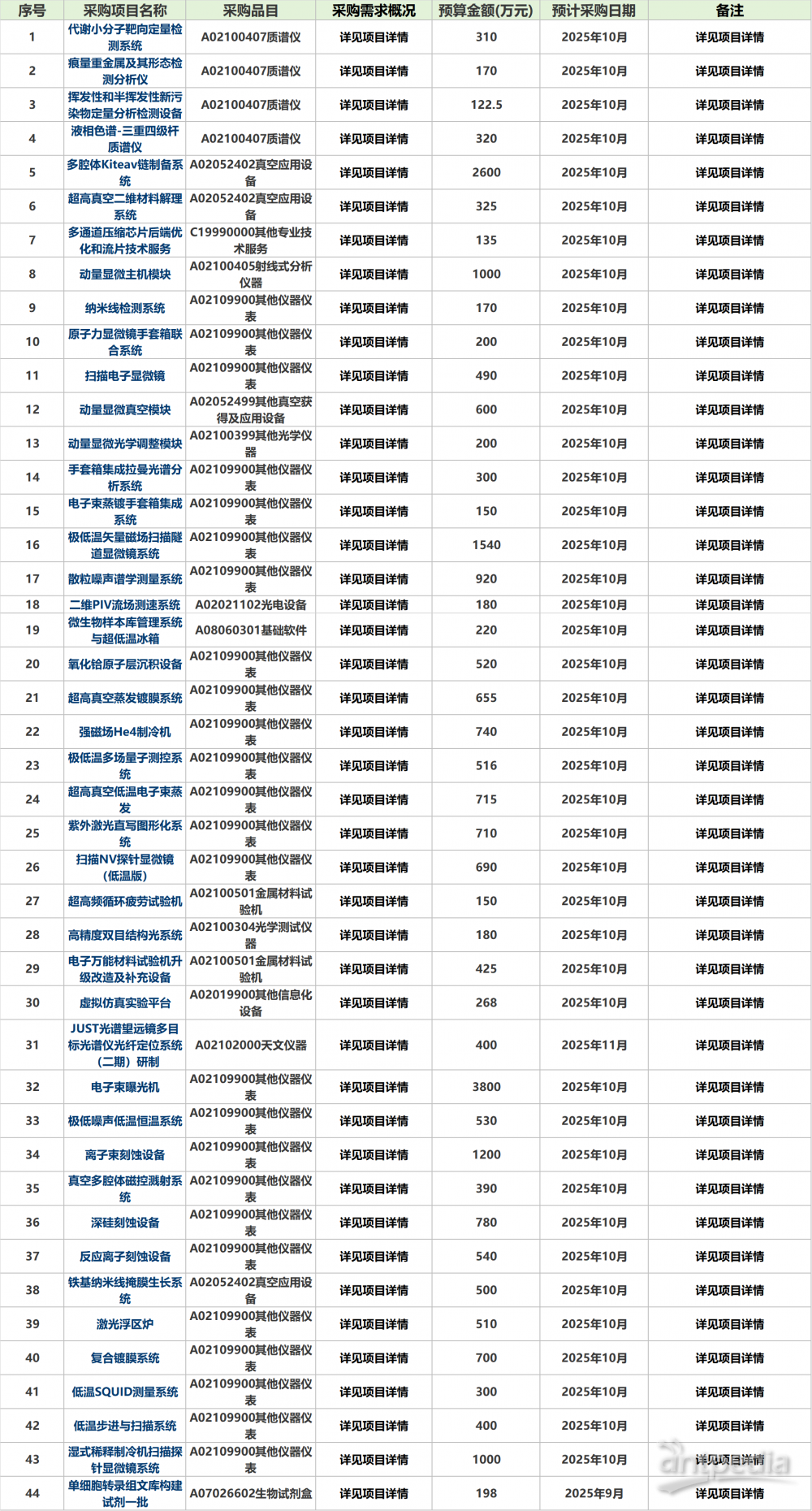 中國政府采購網(wǎng)消息,近日,上海交通大學(xué)連續(xù)發(fā)布2025年度9月、10月及11月政府采購意向。內(nèi)容顯示,該批次采購意向采購標(biāo)的涵蓋多類科研儀器設(shè)備及專業(yè)技術(shù)服務(wù),包括代謝小分子靶向定量檢測系統(tǒng)、液相色譜 -三重四級桿質(zhì)譜儀、極低溫矢量磁場掃描隧道顯微鏡系統(tǒng)等。公開信息顯示,該批次采購預(yù)算總金額達(dá)到2.67億元,采購日期方面,除“單細(xì)胞轉(zhuǎn)錄組文庫構(gòu)建試劑一批”及“JUST光譜望遠(yuǎn)鏡多目標(biāo)光譜儀光纖定位系統(tǒng)(二期)研制”將于9月和11月采購之外,其余項(xiàng)目均將于10月份進(jìn)行采購。具體信息已項(xiàng)目相關(guān)采購公告和采購文件為準(zhǔn)。