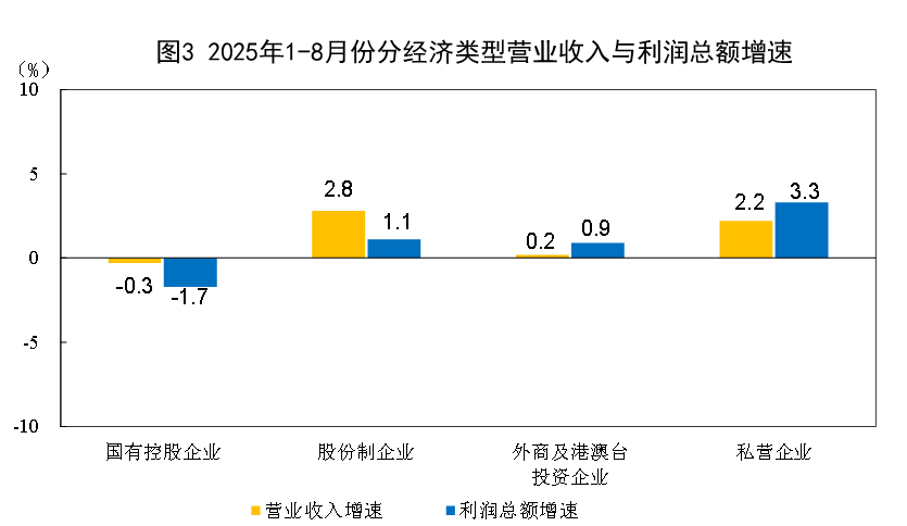 18月份,規模以上工業企業中,國有控股企業實現利潤總額15156.5億元,同比下降1.7%;股份制企業實現利潤總額34931.9億元,增長1.1%;外商及港澳臺投資企業實現利潤總額11723.6億元,增長0.9%;私營企業實現利潤總額13076.1億元,增長3.3%