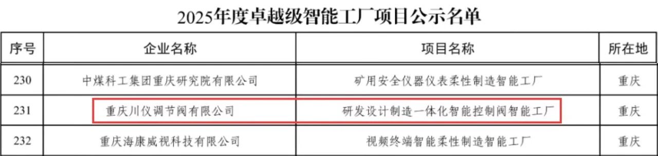 川儀股份所屬重慶川儀調節閥有限公司“研發設計制造一體化智能控制閥智能工廠”入選工業和信息化部“2025年度卓越級智能工廠”
