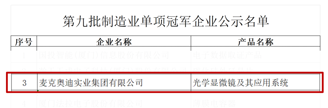 制造業(yè)單項冠軍企業(yè),是指長期專注于制造業(yè)特定細分領域,生產技術或工藝水平國際先進,單項產品(生產性服務)市場占有率位居全球前列的企業(yè)。該獎項是工信部為推動制造業(yè)高質量發(fā)展而開展的培育提升專項行動的重要組成部分,代表了我國制造業(yè)向中高端邁進的方向。此次麥克奧迪光學“顯微鏡及其應用系統(tǒng)”產品的成功獲評,既是對我司在該領域的技術積淀、市場份額、品質把控等方面的高度認可,更是對“創(chuàng)新智造,引領顯微科技”理念的最佳詮釋。