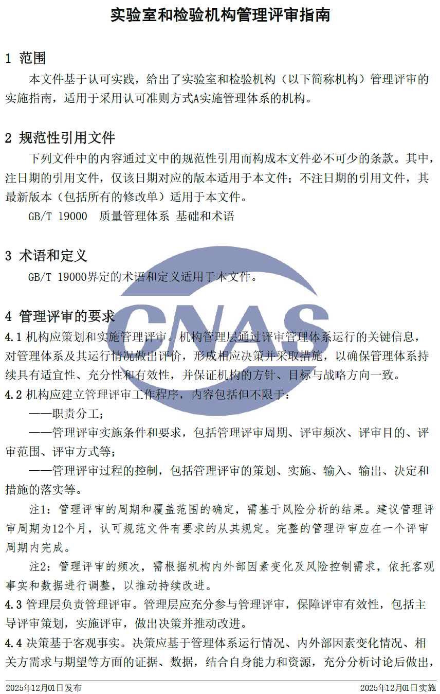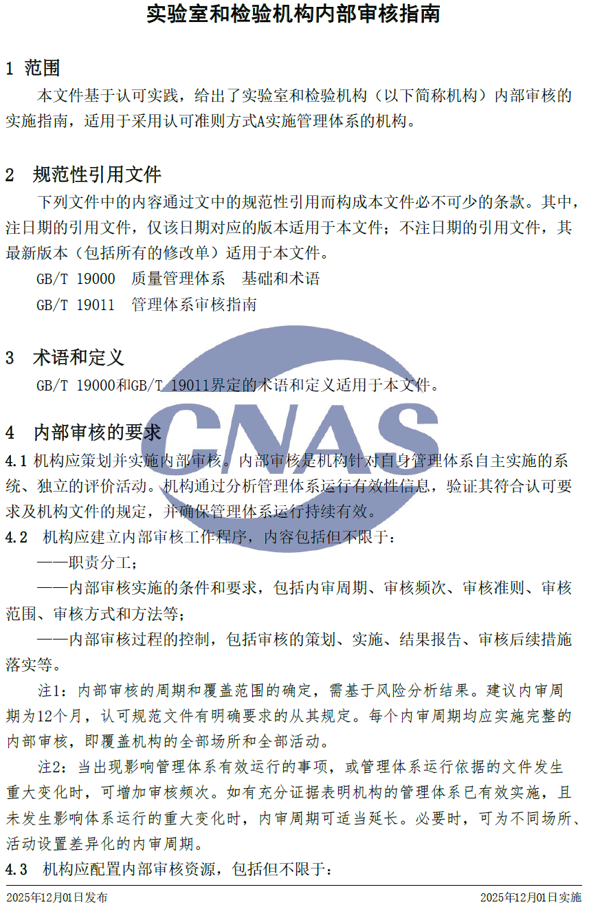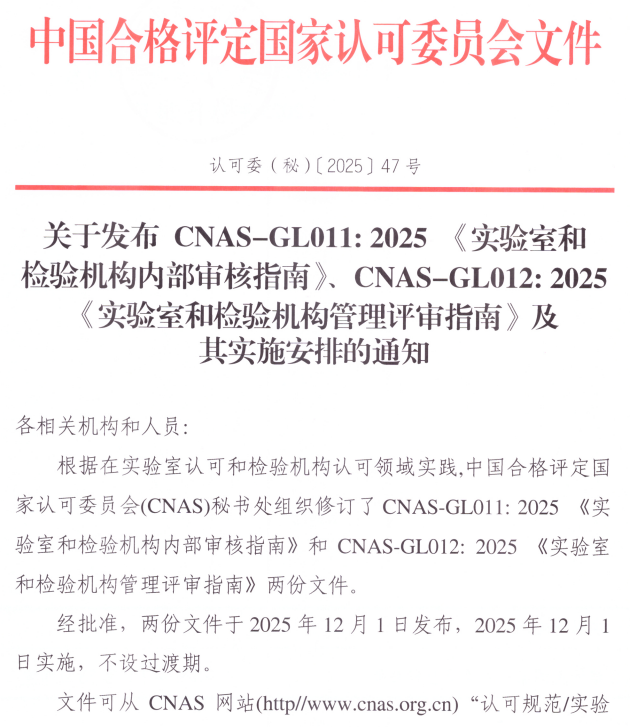 摘要:中國合格評定國家認可委員會(CNAS)近日發布CNAS-GL011:2025 《實驗室和檢驗機構內部審核指南》和CNAS-GL012:2025 《實驗室和檢驗機構管理評審指南》。兩份文件已于2025年12月1日正式實施。