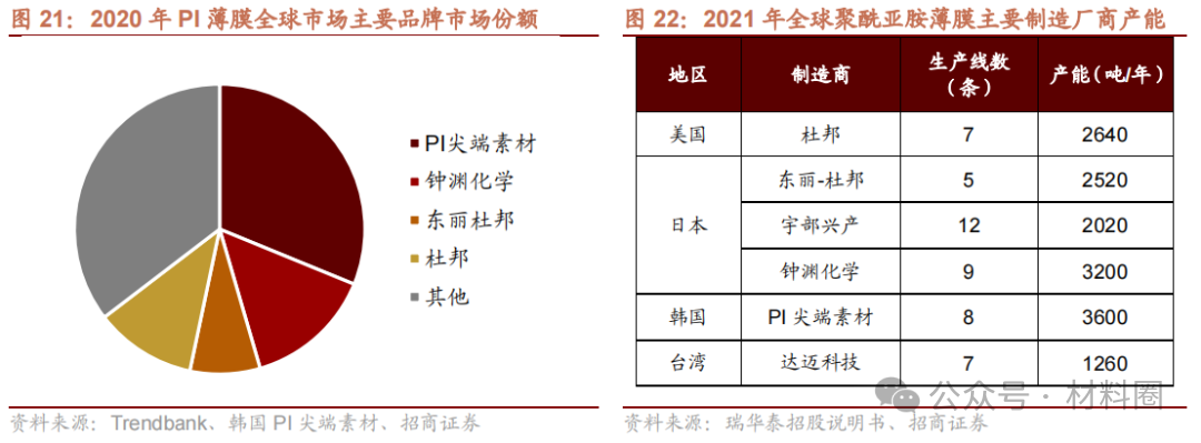PI薄膜行業(yè)呈寡頭壟斷,產(chǎn)能集中于美、日、韓。生產(chǎn)高性能PI膜對(duì)設(shè)備定制、制作工藝、技術(shù)人才等方面要求苛刻,再加上發(fā)達(dá)國家行業(yè)寡頭對(duì)PI薄膜生產(chǎn)技術(shù)、生產(chǎn)工藝進(jìn)行嚴(yán)格保護(hù)。目前這一領(lǐng)域呈現(xiàn)寡頭壟斷的競爭格局,90%以上的市場份額掌握在美國、日本、韓國生產(chǎn)商的手中。杜邦(Dupont)、日本宇部興產(chǎn)(Ube)、鐘淵化學(xué)(Kaneka)、日本三菱瓦斯MGC、韓國PI尖端素材(原SKPI)以及中國臺(tái)灣地區(qū)達(dá)邁科技(Taimide)是當(dāng)前全球聚酰亞胺薄膜的主要生產(chǎn)商。