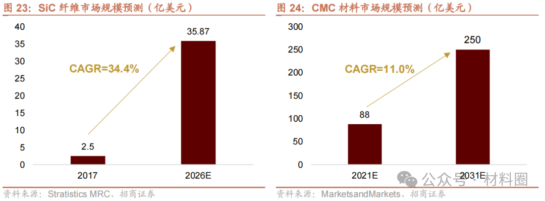預(yù)計(jì)未來各國對(duì)航空航天領(lǐng)域的投入加大,推動(dòng)SiC纖維規(guī)模高速增長。根據(jù)Stratistics MRC預(yù)測,2026SiC纖維的市場規(guī)模將增長至35.87億美元,2017~2026年間復(fù)合年增長率將達(dá)到34.4%。SiC纖維下游最主要的應(yīng)用之一是SiC纖維復(fù)合陶瓷基材料(CMC材料),未來十年,伴隨著綜合國力的增強(qiáng)以及國際形勢的不確定性,以中國為代表的主要發(fā)展中國家有望加大航空航天領(lǐng)域的投入力度。在此背景下,憑借輕量化、高耐熱、抗氧化的顯著優(yōu)勢,CMC材料的使用率有望大幅增長。根據(jù)MarketsandMarkets預(yù)測,到2031年,全球CMC材料市場規(guī)模將達(dá)到250億美元,2021~2031年間復(fù)合年增長率將達(dá)到11.0%。