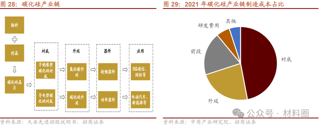 碳化硅生產(chǎn)過程分為單晶生長、外延層生長及器件制造三大步驟,對(duì)應(yīng)的是產(chǎn)業(yè)鏈襯底、外延、器件與模組三大環(huán)節(jié)。其中,襯底和外延占據(jù)主要價(jià)值,在產(chǎn)業(yè)鏈中的成本占比分別為47%、23%。