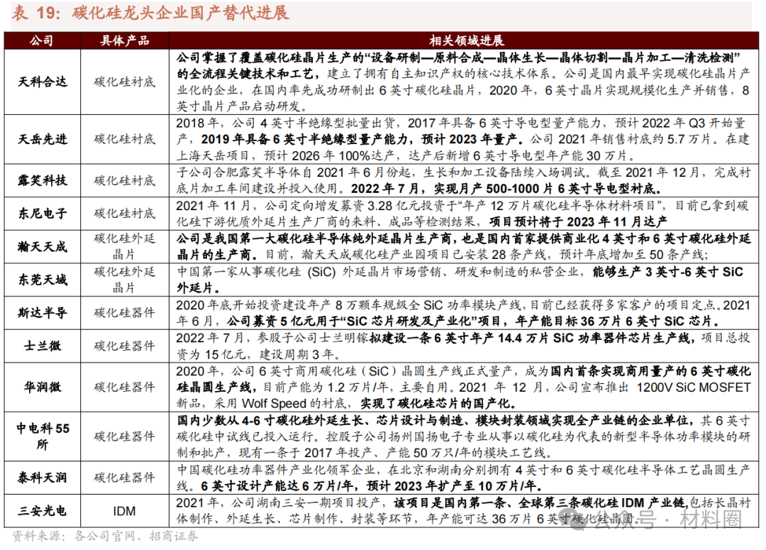 當(dāng)前中國企業(yè)在碳化硅領(lǐng)域市占率低,但已逐漸培育產(chǎn)業(yè)鏈的各個(gè)環(huán)節(jié)。國家對(duì)該產(chǎn)業(yè)發(fā)展也頗為重視,通過863計(jì)劃、國家02重大專項(xiàng)促進(jìn)其發(fā)展,并將碳化硅襯底列入十三五《戰(zhàn)略性新興產(chǎn)業(yè)重點(diǎn)產(chǎn)品目錄》。以天科合達(dá)和天岳先進(jìn)為主的國內(nèi)碳化硅晶片廠商發(fā)展速度較快,其中天科合達(dá)的部分產(chǎn)品在核心參數(shù)上已經(jīng)達(dá)到國際先進(jìn)水平,碳化硅晶片產(chǎn)品對(duì)外銷往北美、歐洲、日本、韓國等國家和地區(qū),市占率提升明顯;而天岳先進(jìn)碳化硅產(chǎn)品已成功批量供應(yīng)于國內(nèi)碳化硅行業(yè)的下游核心客戶,同時(shí)被國外知名的半導(dǎo)體公司使用。公司 6 英寸導(dǎo)電型碳化硅襯底產(chǎn)品已于 2019 年中標(biāo)國家電網(wǎng)的采購計(jì)劃。