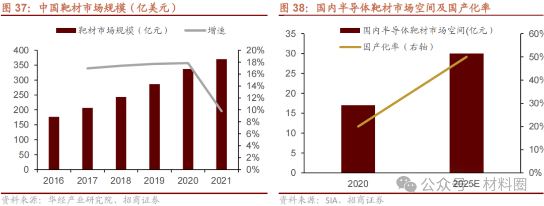 我國高端靶材主要從美日韓進(jìn)口,半導(dǎo)體靶材國產(chǎn)化率僅20%。我國靶材市場規(guī)模約為370億元,與國際知名企業(yè)生產(chǎn)的濺射靶材相比,我國濺射靶材的生產(chǎn)水平還存在相當(dāng)大的差距,高端靶材主要從美日韓進(jìn)口。就半導(dǎo)體靶材而言,據(jù)SIA估計(jì),2020年國內(nèi)半導(dǎo)體領(lǐng)域用濺射靶材市場規(guī)模17億元人民幣,預(yù)計(jì)到2025年將增長至30億元人民幣。2020年國產(chǎn)化率僅20%,仍有巨大提升空間。