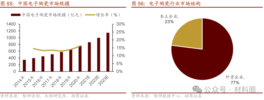 在下游光纖通訊、國防軍事等應(yīng)用場景擴(kuò)大及高速增長、下游利好國家政策的作用下,國內(nèi)電子陶瓷市場規(guī)模由2014年的346.6億元增長至2019年的657.7億元,國內(nèi)電子陶瓷企業(yè)向高端化、高附加值轉(zhuǎn)型升級(jí)的方向不斷推進(jìn)。預(yù)計(jì)我國電子陶瓷市場規(guī)模億年復(fù)合增長率15%的速度在2023年達(dá)到1145.4億元。在市場結(jié)構(gòu)上,與日本、美國電子陶瓷企業(yè)相比,我國電子陶瓷企業(yè)中低端產(chǎn)品依然占據(jù)主流。電子整機(jī)中很多技術(shù)含量高的陶瓷元器件仍然依賴進(jìn)口,在市場規(guī)模、產(chǎn)品檔次與技術(shù)水平上依然存在一定差距。數(shù)據(jù)顯示,中國本土電子陶瓷企業(yè)在國內(nèi)僅占據(jù)23%的市場份額,其余77%的市場份額仍被日本、美國等外資企業(yè)占據(jù)。
