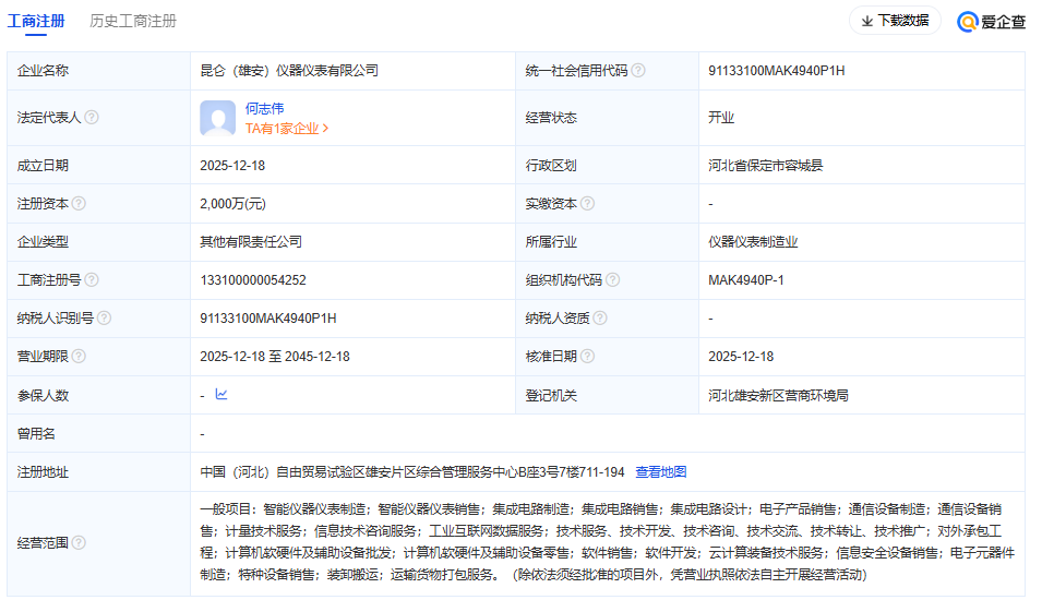 近日,昆侖(雄安)儀器儀表有限公司成立,法定代表人為何志偉,注冊(cè)資本2000萬(wàn)元人民幣,經(jīng)營(yíng)范圍涵蓋智能儀器儀表制造與銷售、集成電路設(shè)計(jì)與制造、通信設(shè)備制造、計(jì)量技術(shù)服務(wù)等高新技術(shù)領(lǐng)域。