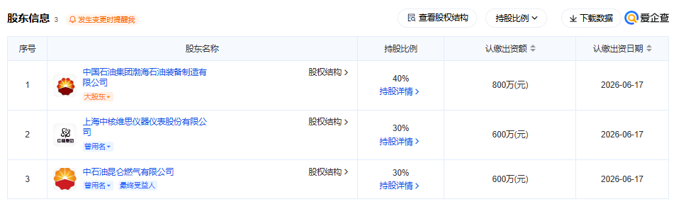 股權(quán)穿透圖顯示,該公司由中國(guó)石油天然氣集團(tuán)有限公司旗下中國(guó)石油集團(tuán)渤海石油裝備制造有限公司、中石油昆侖燃?xì)庥邢薰尽⑸虾V泻司S思儀器儀表股份有限公司共同持股。