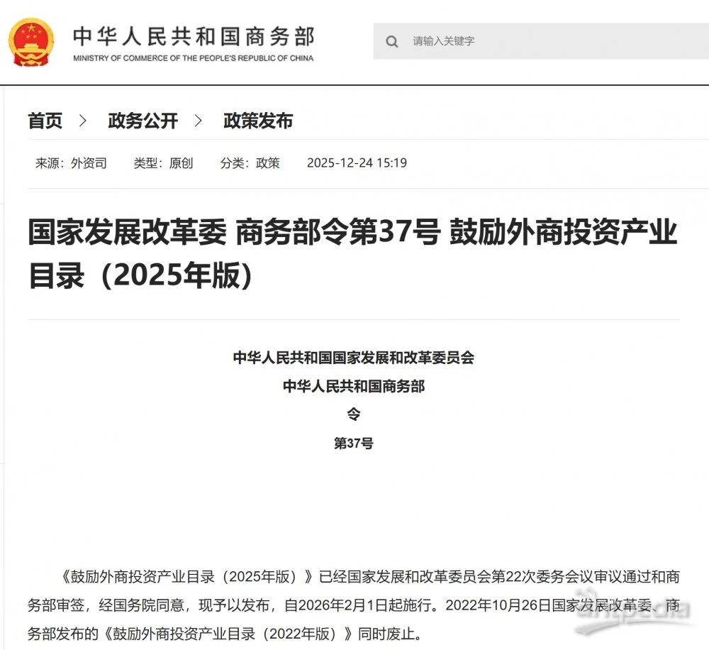 近日,經(jīng)國(guó)務(wù)院同意,國(guó)家發(fā)展改革委、商務(wù)部全文發(fā)布《鼓勵(lì)外商投資產(chǎn)業(yè)目錄(2025年版)》(以下簡(jiǎn)稱《鼓勵(lì)目錄》),自202621日起施行。