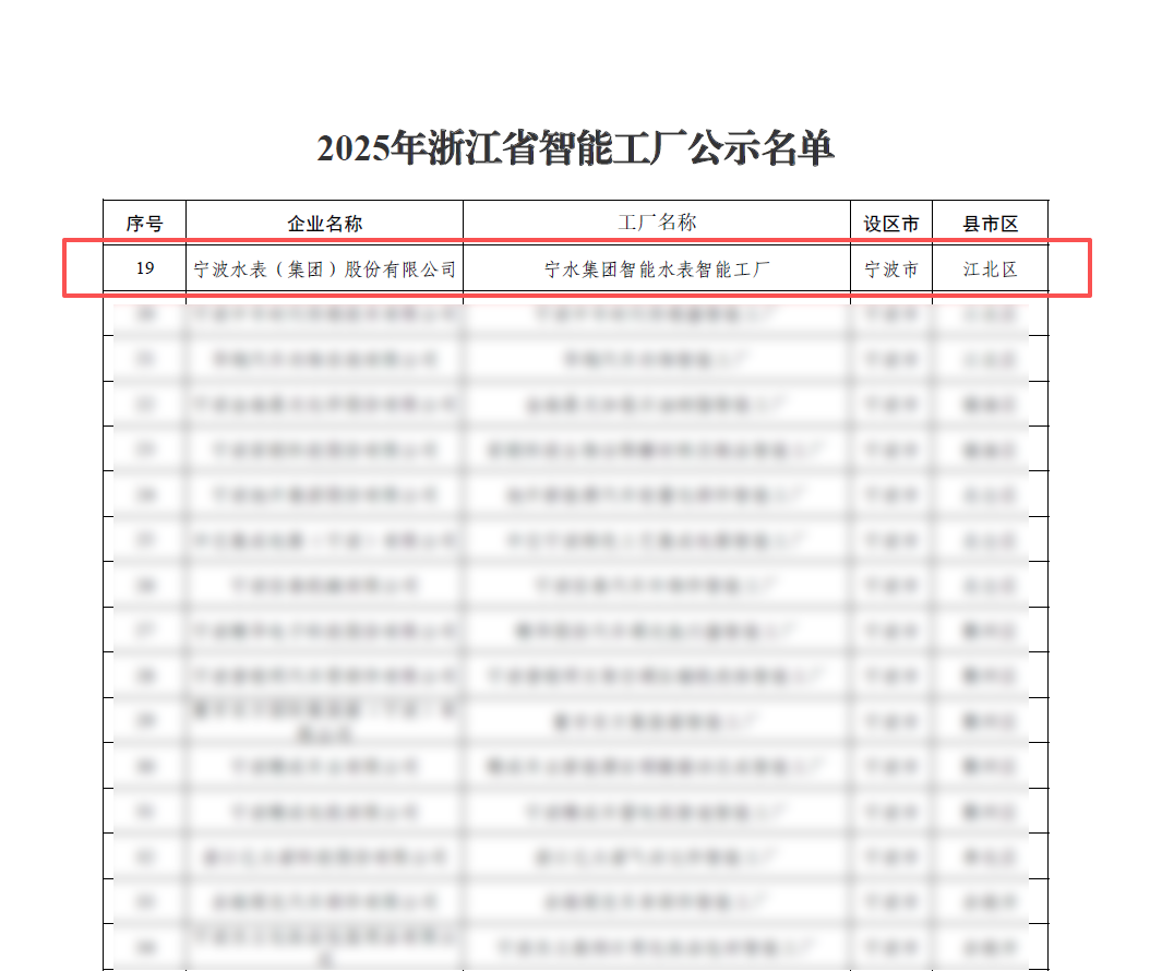 近日,浙江省經濟和信息化廳正式公示了2025年度浙江省智能工廠項目名單,寧波水表(集團)股份有限公司(以下簡稱“寧水集團”)憑借“寧水集團智能水表智能工廠”項目成功入選。此次獲評不僅是權威部門對寧水集團智能制造實力的高度認可,更是寧水集團以系統化、前瞻性的數字化轉型藍圖為引領,扎實推進智能化建設的標志性成果展現。